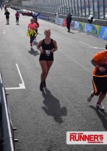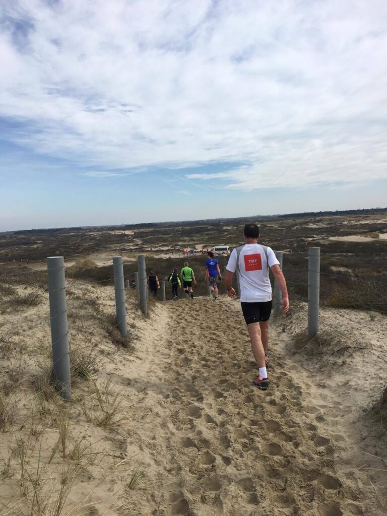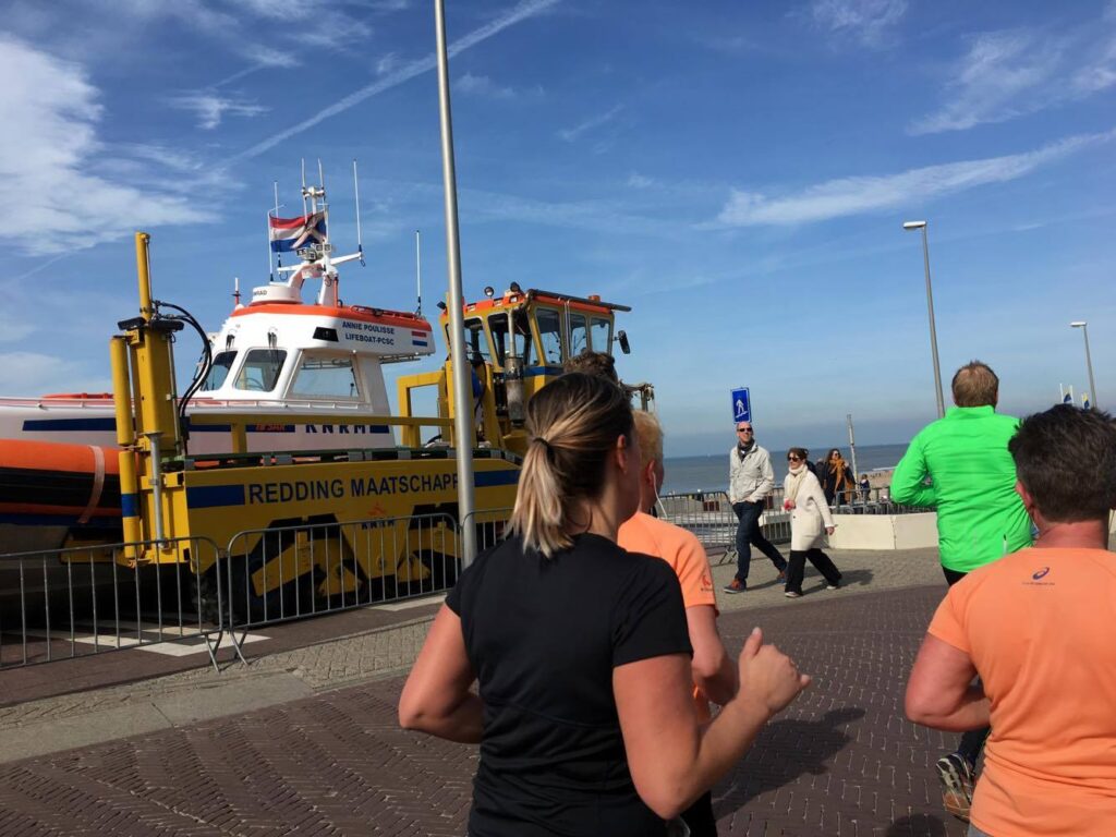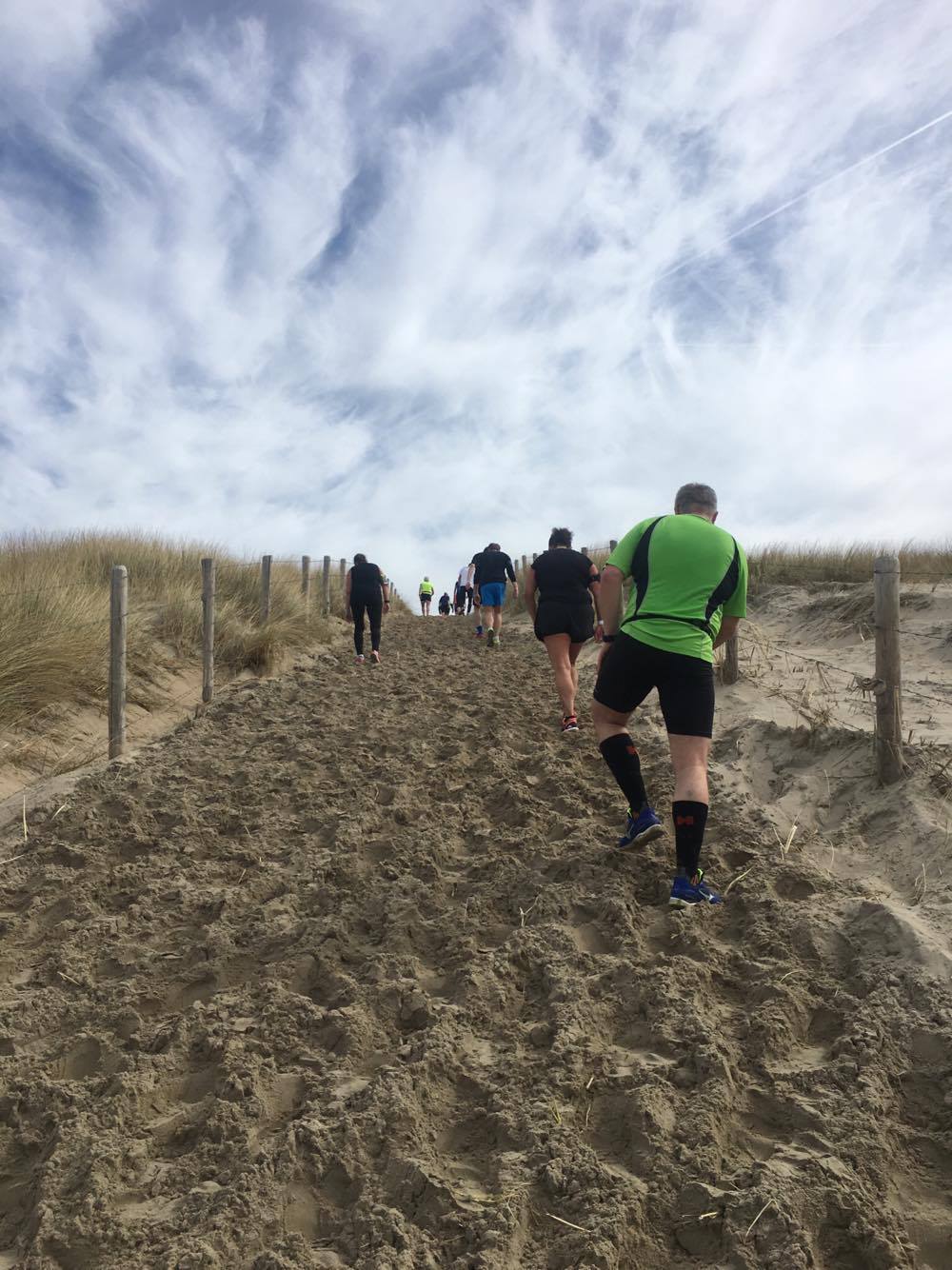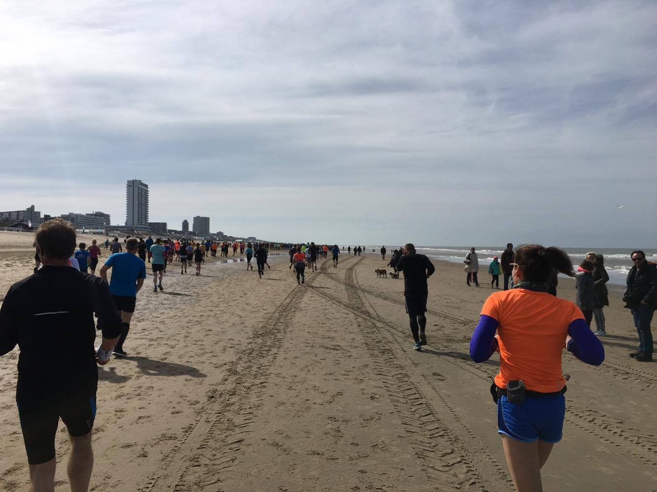 Zodra de boulevard uit zicht is, zie ik ook meteen minder mensen op het strand. Het loopt wel een stuk relaxter. Na 13 km zie ik welke strandafrit ik moet nemen, deze is van de categorie één stap omhoog drie stappen terug. Dit is niet hardlopend te doen. Jammer, het ging zo lekker! Ik zeg nog tegen mijn loopmaatje Bonnie: “Kijk! Rechtdoor zie je het Grand Hotel Huis ter Duin. Dat is Noordwijk! Daar heb je wel een normale afrit.”