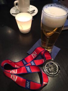 Eindelijk kom ik weer in de bewoonde wereld en meng ik me tussen de 12 kilometer lopers. Oei, dat werkt niet echt motiverend, die zien er nog zo fris uit. Nog een paar kilometer op karakter door het gezellige dorp, gelukkig met heel veel aanmoedigingen! Iedereen staat gezellig voor de cafeetjes met een biertje. Na 20 km kom ik weer aan op het circuit, nu echt de laatste loodjes. Ik zie mijn moeder en een vriendin aan de kant staan. Yes, ik heb het gehaald!