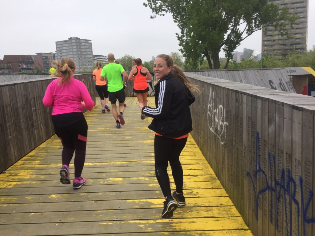 Na drie kilometer komen we aan de bij Luchtsingel. Twee jaar geleden werd deze 390 meter lange geel geverfde houten voetgangersbrug geopend. De brug verbindt Rotterdam-Noord met Rotterdam-Centrum. Na mijn marathon van een maand geleden is de afstand van deze run het probleem niet, maar de hoeveelheid trappen zijn pittig. Vanaf de brug zie ik het Hofplein met daarnaast het 80 meter grote spandoek dat Feyenoord-supporters een dag ervoor hebben opgehangen. Ik krijg er kippenvel van.