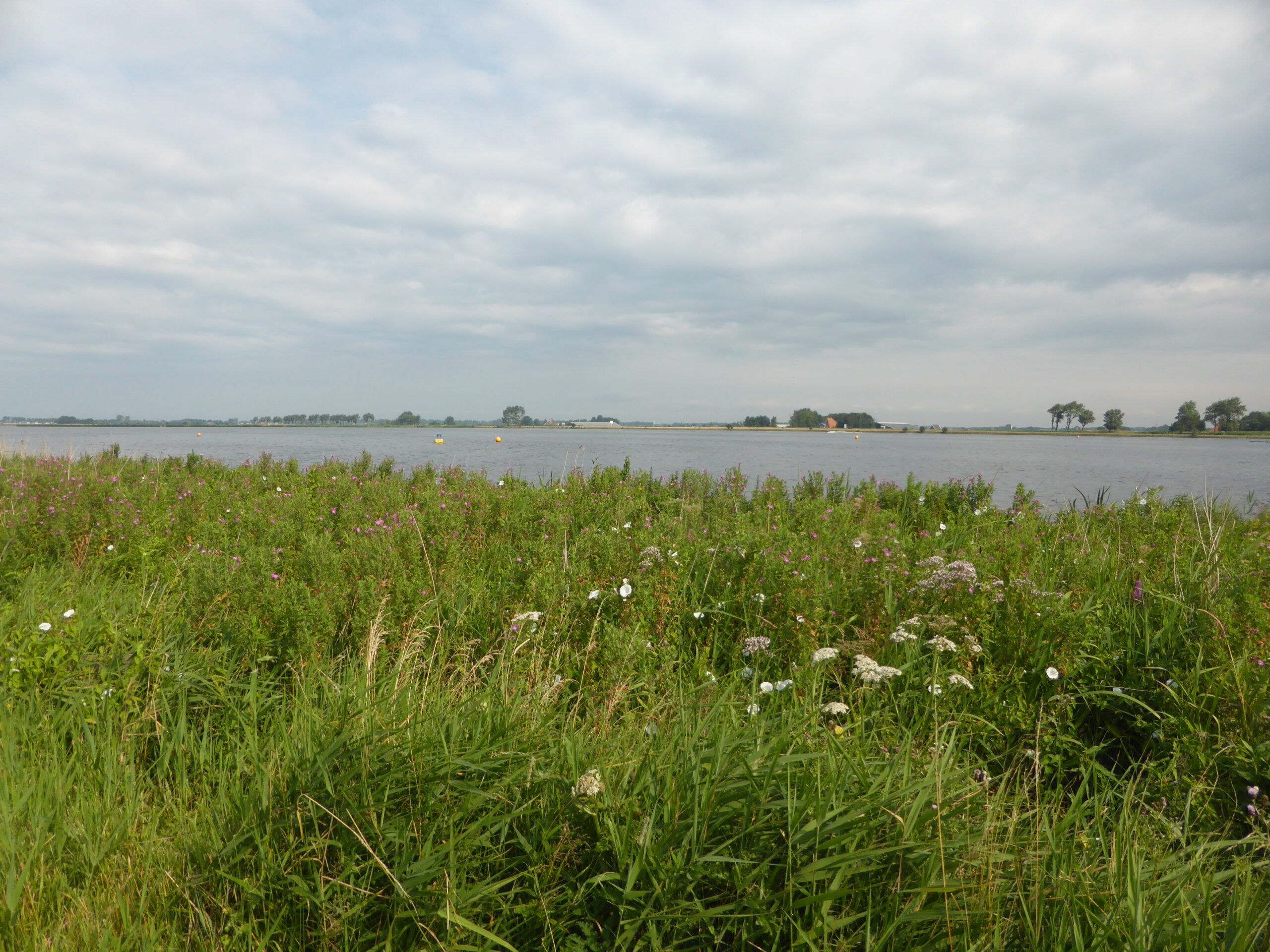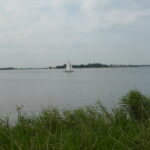 Een landelijke geur dringt zich aan mij op, de boer is zijn land aan het bemesten. Het is benauwd en we zweten flink. De vliegen die eerst achter de gierkar hingen komen nu mij gezelschap houden. Alles kriebelt meteen, maar dat kan ook komen door het hoge gras. Ik loop op het dijkje en iets lager kan ik op een vlak zandpad lopen. Dan ben ik echter het prachtige rustgevende uitzicht over het meer kwijt, dus ik hobbel door. Het is bijna windstil en er dobberen wat zeilbootjes op de gladde uitgestrekte waterplas. wat een zaligheid.