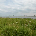 Bij de waterkant aangekomen waar boten in allerlei formaten aan de steiger liggen, gaan we van start in noordelijke richting. We rennen over het ophaalbruggetje en het smalle sluisje dat nog gebruikt wordt door dorpsbewoners met een eigen bootje. Aan onze rechterhand lopen we langs de smalle camping met vaste staanplaatsen. Vlak voor we bij het oude stoomgemaal komen slaan we linksaf een trappetje af naar beneden. “Ik denk dat het een beetje een trailrun wordt vandaag”, zeg ik tegen Marco. Een pad is er niet, dus we hobbelen door het hoge gras met om ons heen vrolijk gekleurde wilde bloemen. Het gebied is een waar paradijs voor natuurliefhebbers met veel verschillende weidevogels. Ik ben geen vogelkenner, maar de grutto, de kievit en zelfs de kemphaan zijn hier kind aan huis.
