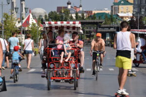 Gisteravond liep ik hier ook met Dina en haar twee dochters. Dina blijkt dol te zijn op Nederland en speelt daar regelmatig in de theaters als fluitist in het Tartaarse nationale orkest. De hele familie is erg muzikaal en ze stonden er op iets te spelen voor mij op de piano’s die her en der verspreid staan. De drukte van de avond hiervoor vormt een groot contrast met nu. Ik ren langs de draaimolen die nu nog stilstaat en langs alle huurfietsen die over een paar uur weer over het strakke fietspad zullen kruipen. Als praktische fietser uit Nederland vergeet ik soms dat deze manier van bewegen voor veel mensen gewoon een leuk uitje is.