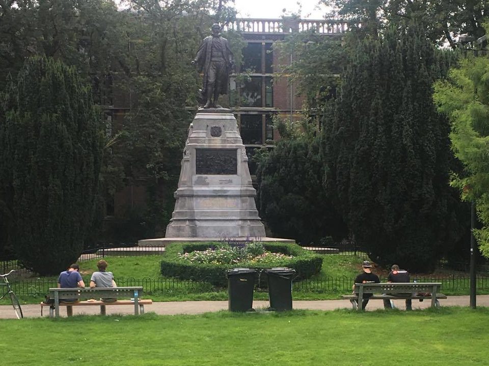 Wel staat er op het pleintje een kunstwerk ter herinnering aan de schilder. Verbouwereerd rennen we verder. Ik herinner me dat hier vlakbij het Rembrandtpark ligt wat ik voornamelijk ken van de Barbecue- en Grillfestivals. Deze slaan we voor dit keer over en gaan richting de Groenhazengracht.