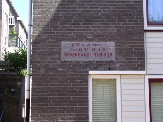 Al snel rennen we door de Weddesteeg langs de plaats waar het geboortehuis heeft gestaan van de beroemde Rembrandt van Rijn. Verbaasd kijken we naar een karige gedenksteen in de muur, van een in de jaren 80 gebouwd appartementencomplex. Verder zie je er niks van. Het echte huis schijnt in 1927 al gesloopt te zijn.