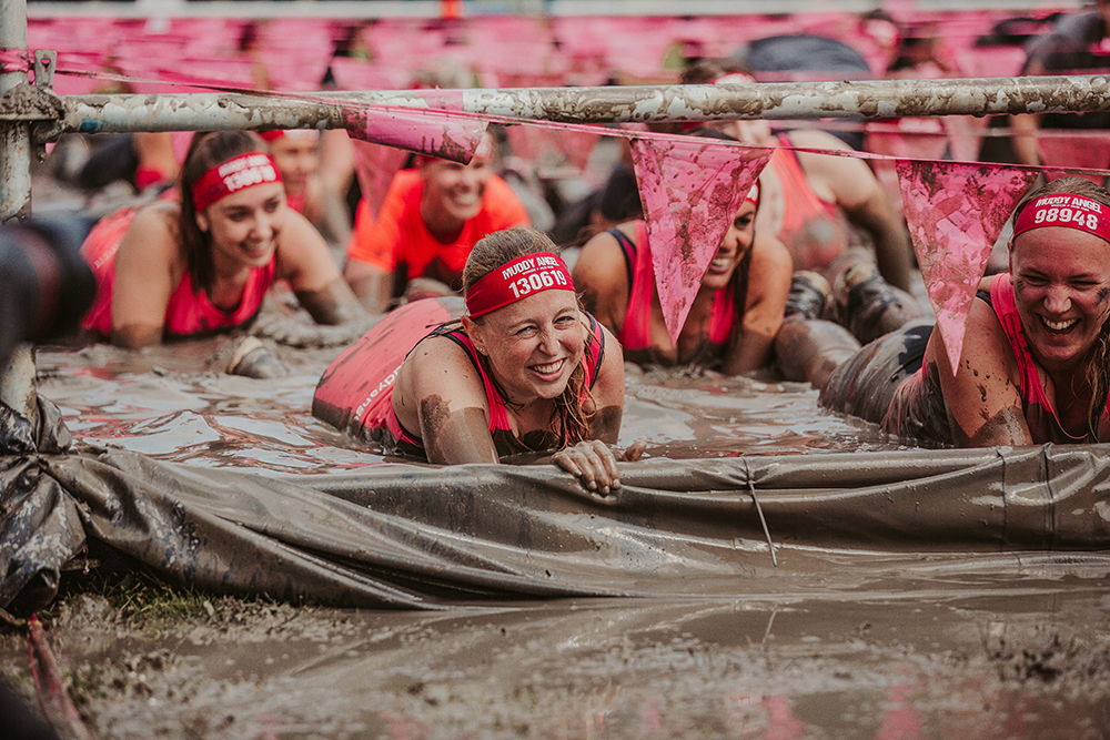 Aangekomen op het terrein in Spaarnwoude ziet het roze van de vrouwen. Overal is het roze: het parcours is afgezet met roze linten, de obstakels zijn roze en iedereen is in het roze gekleed. Het is meteen een gezellige bende met alle deelnemers uit ons team. Niet alleen de roze kleur van onze kleding is een overeenkomende factor, zo goed als iedereen is zenuwachtig. Zenuwachtig voor een 5-kilometerrace? Dat is raar, zal je zeggen. De Muddy Angel Run is niet zomaar een race, het is een obstakelrun door de modder. En laat dat nou net voor zo goed als iedereen de eerste keer zijn.