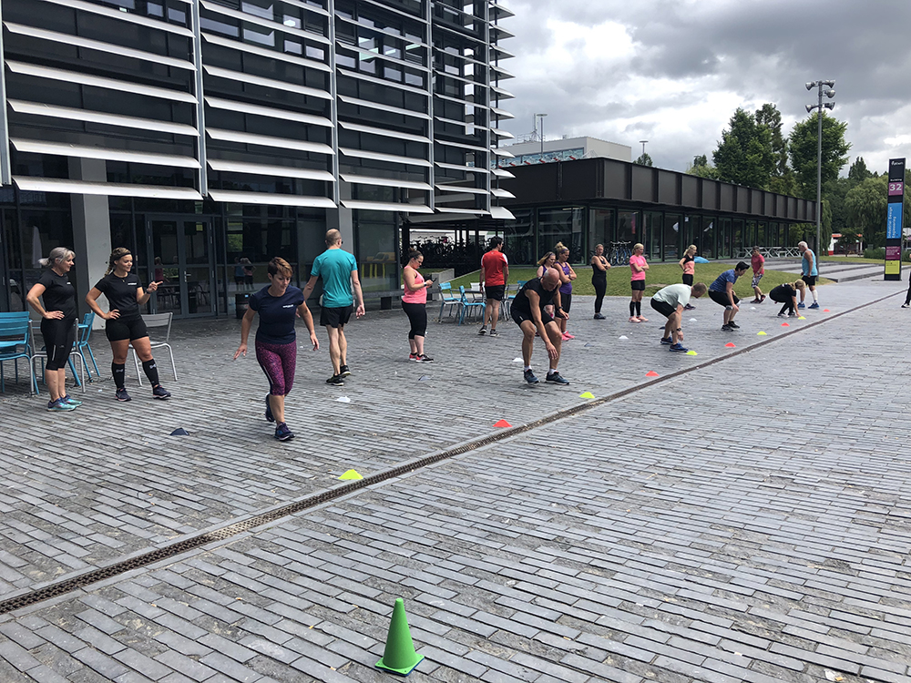 Eenmaal aangekomen bij de TU staan er al veel gekleurde pionnen klaar. Professioneel hardlooptrainer John heeft weer iets leuks voor ons in petto. Bijna een uur lang laat hij ons oefeningen doen om elkaar beter te leren kennen, onze spieren warm te maken, maar ook om ons hardlooptechniek bij te leren. Lang maken tijdens het lopen, armen juist meezwaaien langs je lichaam, het komt allemaal aan bod. Na een laatste spelletje waarbij we zo snel mogelijk de zwarte, witte, rode of blauwe pion moeten aantikken, hebben we nog even tijd voor een stukje hardlopen door de wijk op eigen tempo. Ik besluit lekker langzaam te gaan lopen en met mij lopen er een aantal mee. Esmar en Marjolein gaan uiteraard voor de snelle groep en lopen in totaal bijna vijf kilometer hard.