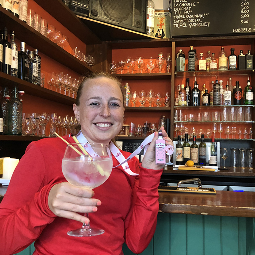 Van te voren hebben we afgesproken vijf kilometer te rennen. “Vijf kilometer loop ik en niet meer!” zegt Femke, die nog geen week geleden een hele marathon in Berlijn liep. Het is zo knap dat ze nu alweer zo soepel loopt. Na een kleine omweg via de Noletmolen en de Nolet Distillery – die je misschien wel kent van de KETEL 1 jenever – moet ik toch Google Maps erbij pakken. Oeps, we zitten al bijna op vijf kilometer en zijn niet heel dicht bij het centrum. “Een rondje van de zaak dan maar.” Na een ruime vijf kilometer en een leuke sightseeingtour door Schiedam drukken we ons klokje uit en is het tijd voor een welverdiende gin-tonic, helemaal passend bij onze prachtige medaille.