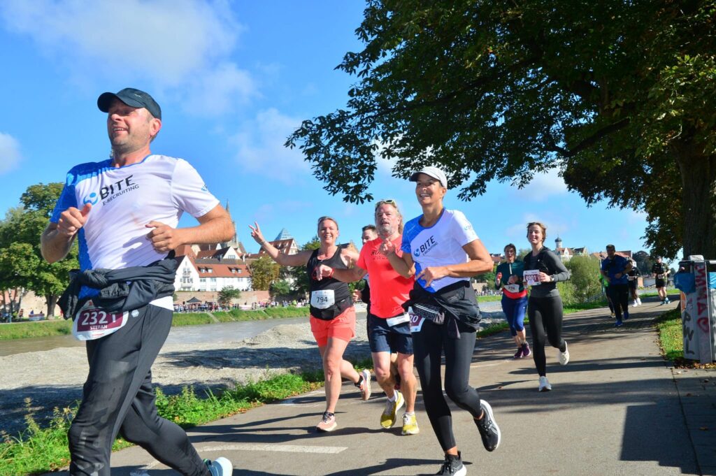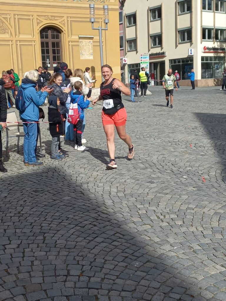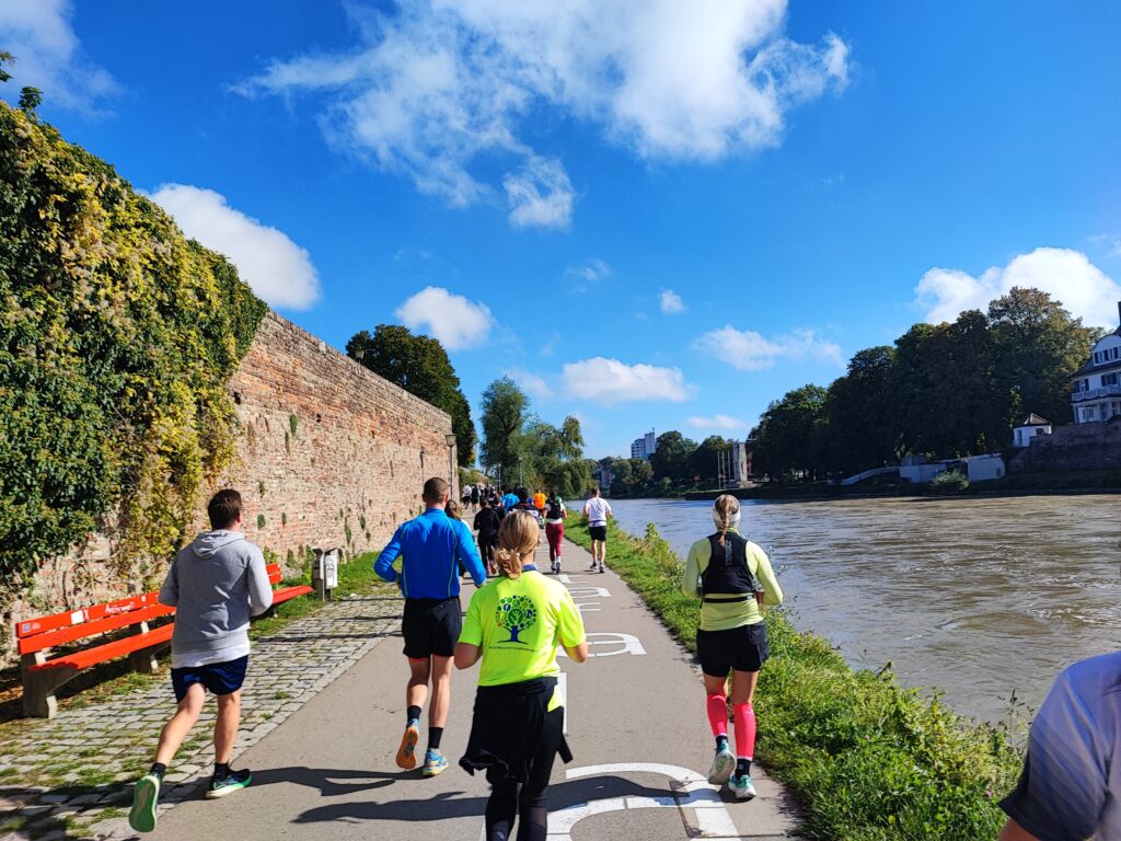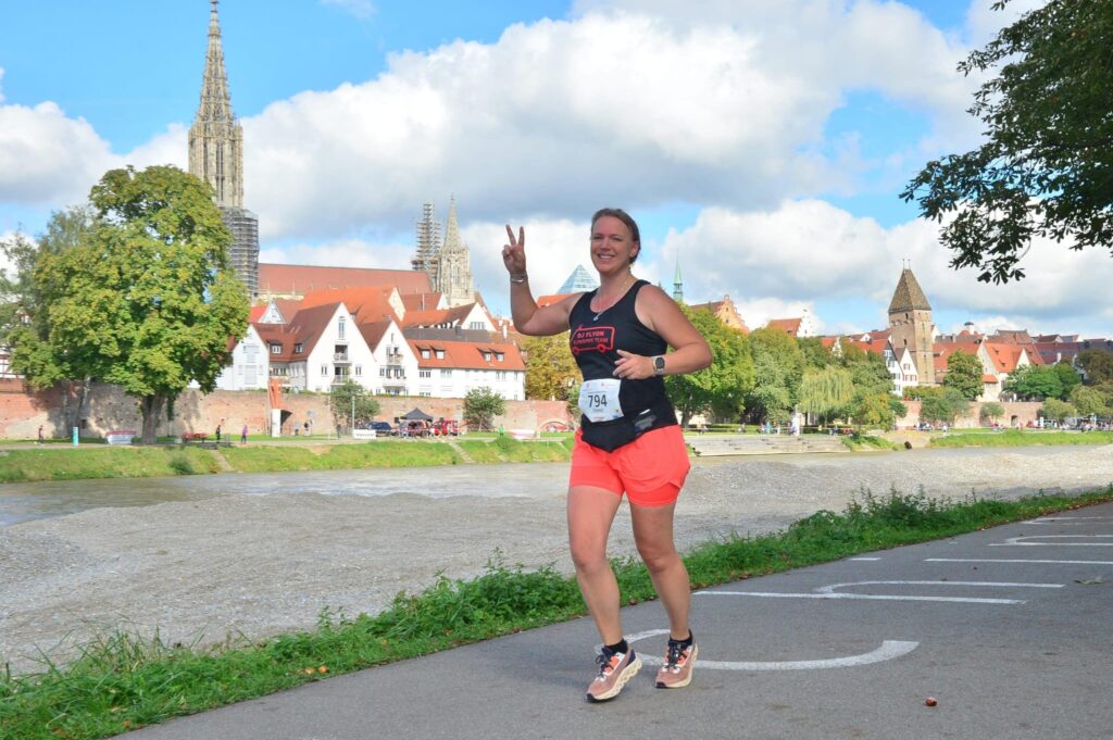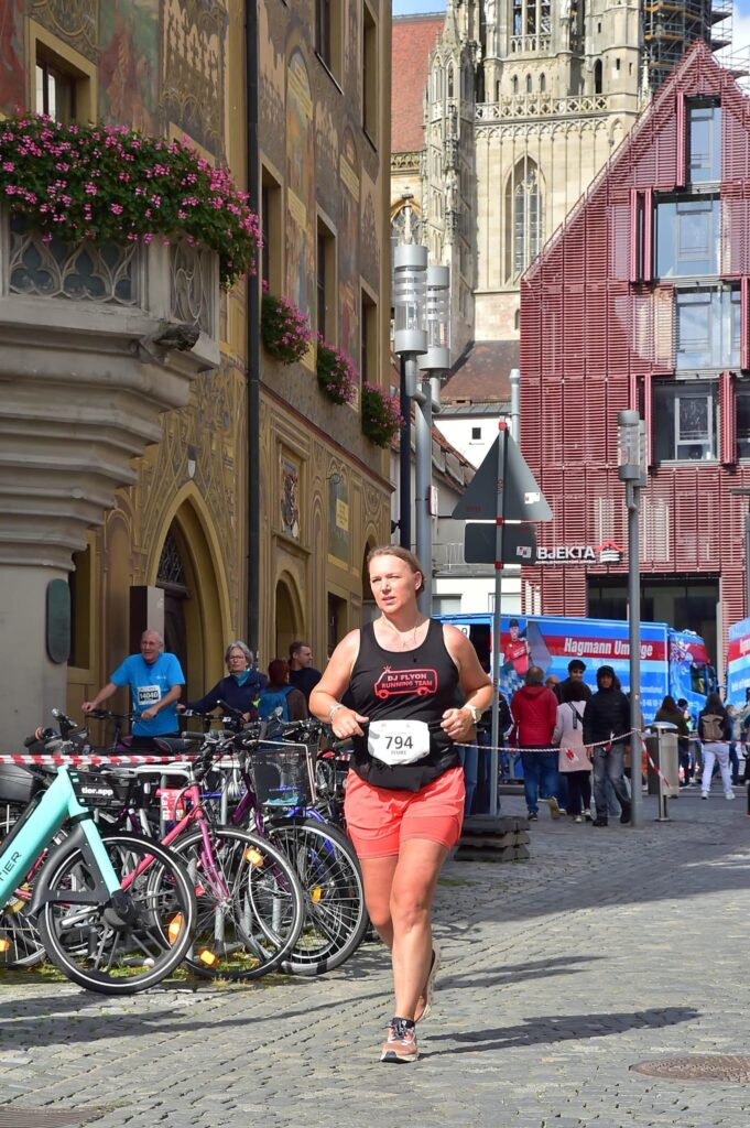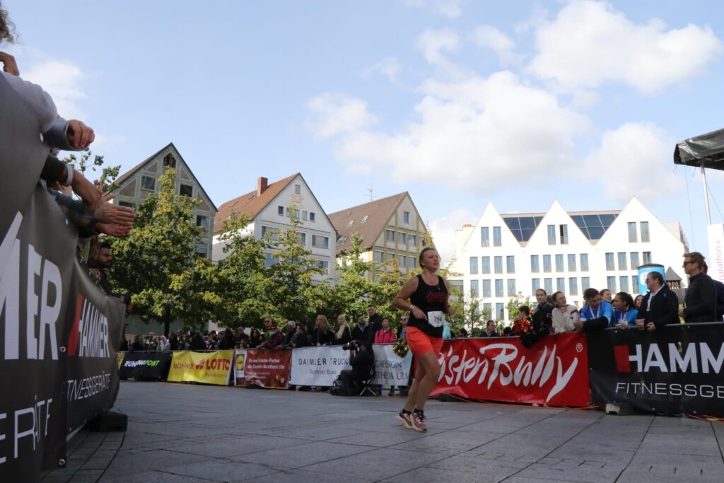 Helaas mag ik nog niet de Altstadt induiken, maar loop ik verder langs de oever van de Donau met aan linkerkant de Ulmer Stadtmauer. Jeetje, wanneer komt die splitsing toch, vraag ik mezelf af. Na heel veel aanmoediging en weer een drankpost mag ik dan toch eindelijk het bordje ‘Ziel’ volgen. Het is een behoorlijk klimmetje omhoog. Er staat iemand van de organisatie me bijna naar boven te schreeuwen. “Femke, du bist fast da! Du schaffst das, es ist nicht mehr so weit! Auf geht’s!“ Ik duik een viaduct onder en ik kom achter een groot gebouw uit. Gelukkig hebben ze alle straten met linten afgezet. Fout lopen kan dus eigenlijk niet. Inmiddels loop ik op de straat waar ik al twee keer eerder heb gelopen, maar dan nu eindelijk aan de andere kant van het lint. Ik duik de Altstadt in. Inmiddels komt de begeleider van de eerste loper van de 10 kilometer met een enorm hoog tempo voorbij en al snel volgt deze eerste loper met een noodgang. Naast me loopt een meneer, die ook de hele marathon doet. Aan aanmoediging hebben we geen gebrek.