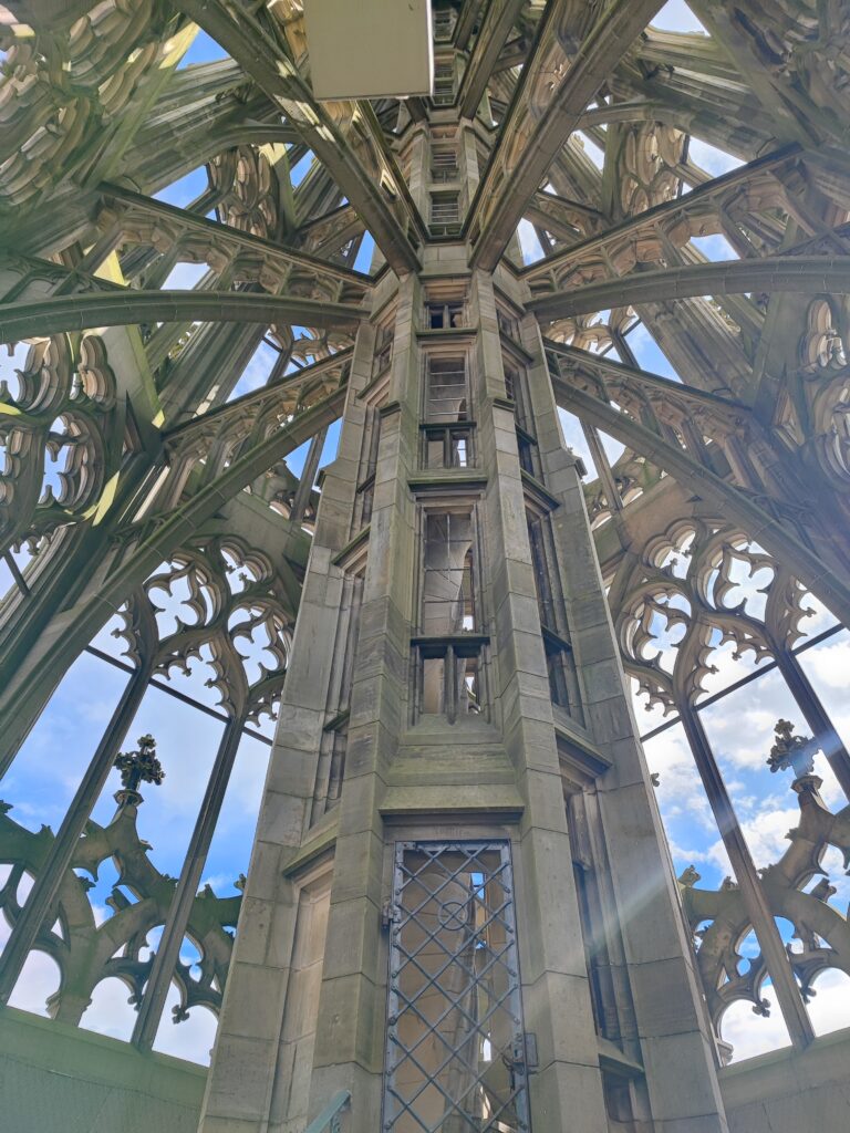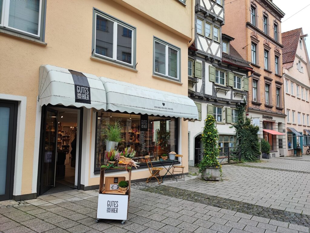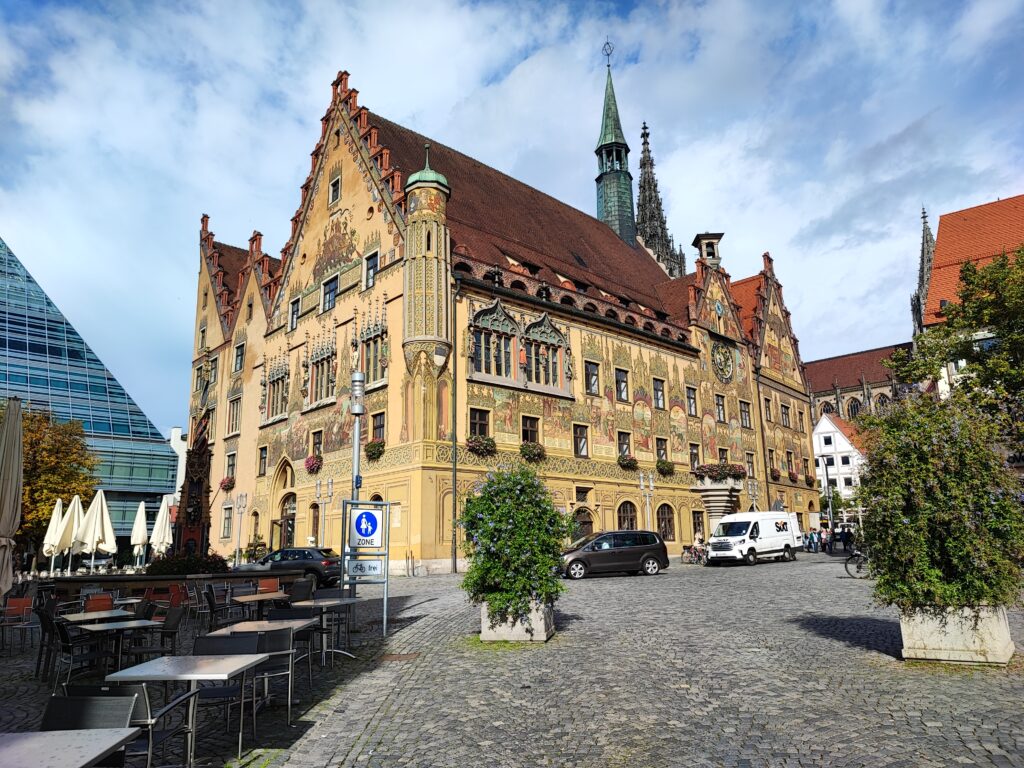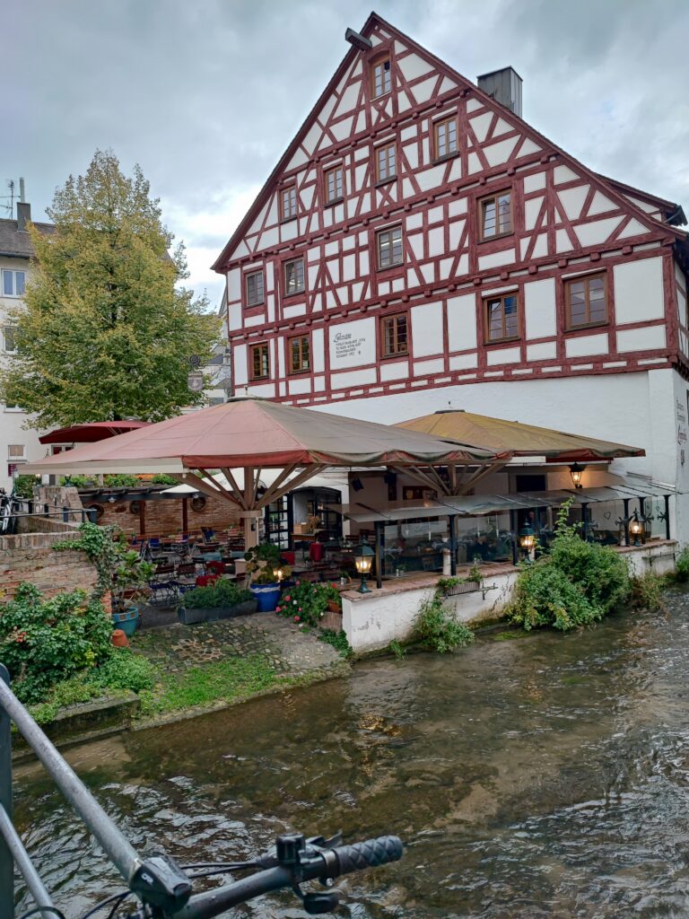 Rond de 4 kilometer gaan we de Donau over en komen we in een mooi uitgestrekt gebied. Ik maak wat foto’s en in de verte zie ik het Munster van Ulm, met de hoogste kerktoren van de wereld van 161,53 meter hoog. Eergister heb ik deze beklommen en hoe hoger ik kwam, hoe sneller ik naar boven ging, want het was me toch wel wat hoog. Niet kijken en doorlopen, dacht ik bij mezelf. Het leverde wel wat spierpijn op, maar het geweldige uitzicht was het waard, echt een aanrader. Met de UlmCard kun je het Munster van Ulm bezoeken, net als ontelbare andere musea. Je kunt met de kaart ook activiteiten boeken en je kunt lekkere dingen verkrijgen.