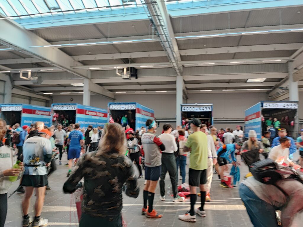 Als we aankomen bij het startgebied staan de vrachtwagens waar je je tas af kan geven, klaar in de Donauhalle. Ik eet nog snel een appel en neem wat te drinken mee. We gaan ondertussen op zoek naar de toiletten/dixies. Heel fijn dat er genoeg dixies zijn, dat er schoon toiletpapier is en dat ik niet lang hoef te wachten.