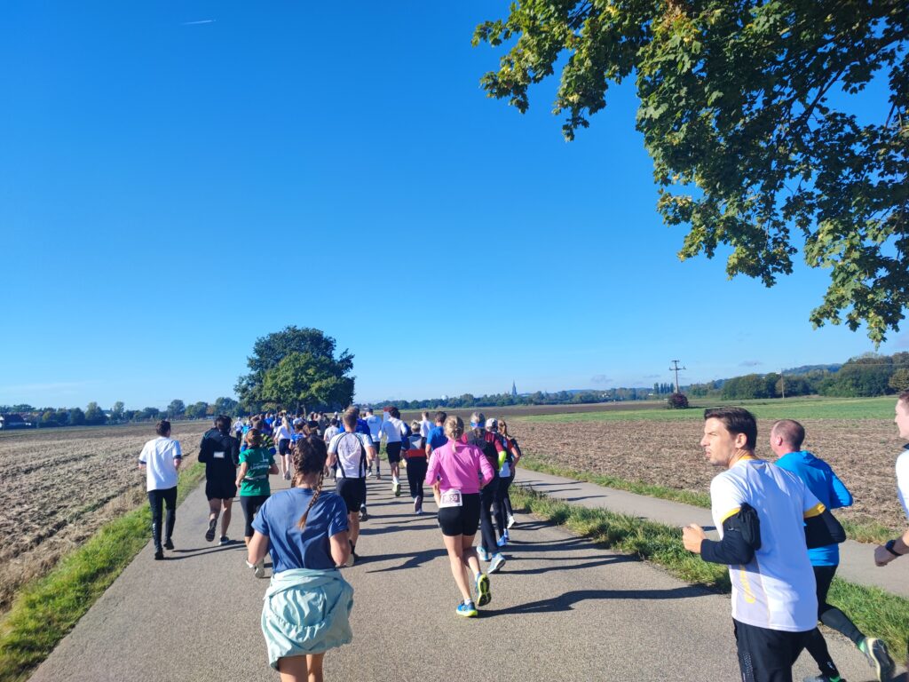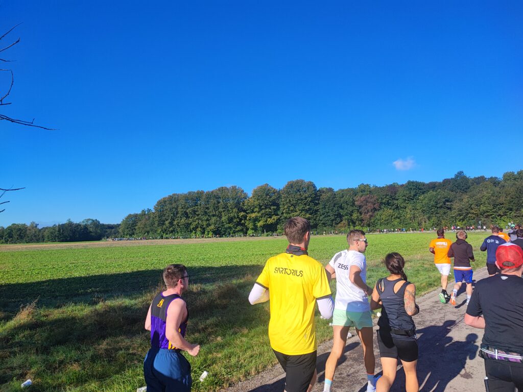 Net voor het 26 kilometerpunt duiken we een bos in, uiteraard omhoog, maar al snel is daar een drankpost. Deze loop heeft echt veel drankposten en iedereen is zo enthousiast aan het aanmoedigen. Alleen weet ik dat drankposten gevaarlijk zijn voor mij, ik drink namelijk altijd snel teveel. Twee slokken per drankpost heb ik mezelf toegestaan. We zijn inmiddels op het 29 kilometerpunt aangekomen. Oh ja, hier moeten we om een meer heenlopen, herinner ik me van de route. Ik zie het meer en denk: Jeetje, dat is best een groot meer. Nou ja, groot, op de plattegrond leek het in elk geval kleiner. Het is de Pfuhler See. Ook hier weer een gravelpad, maar wel een normaal gravelpad. We lopen nog steeds het pittige tempo. Meeuwes loopt wel iets voor me, maar ik vind het wel hard genoeg. Als we het meer rond zijn, stopt hij even om volgens mij een verpakking van een gelletje in de prullenbak te gooien. We lopen verder en komen weer langs de drankpost. Meeuwes zegt: “Ik voel m’n bovenbenen. Ik haal je zo wel weer in.” Ik vervolg mijn weg op hetzelfde tempo.