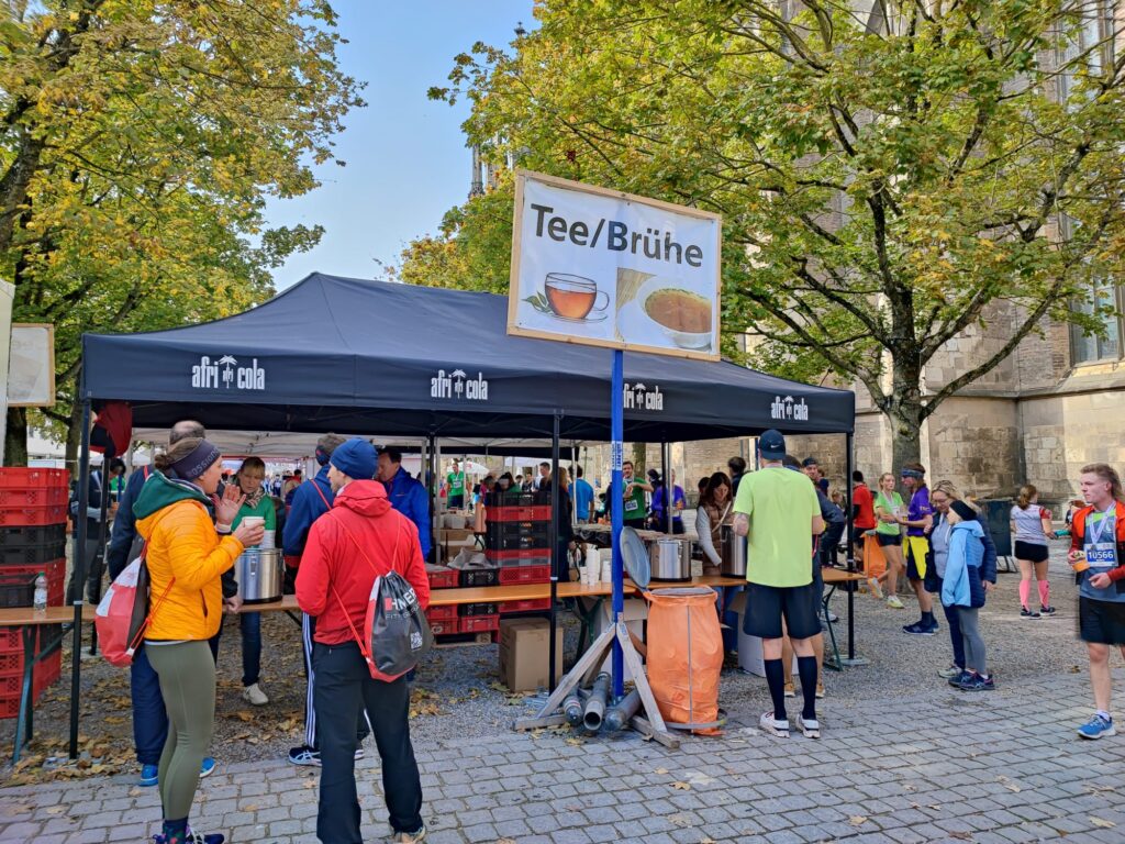 Na de finish krijg ik al snel mijn medaille en kan ik mijn tijd niet geloven: 4.54.1. Eindelijk mijn zevende marathon gehaald en deze moest van ver komen. Ik loop het finishgebied in en weet niet waar ik moet kijken. Het lijkt wel of ik bij een markt ben aangekomen met allerlei verzorging: fruit, water met of zonder bubbels, noten, Apfelschörle, diverse soorten bier, bouillon, thee en ik zie zelfs popcorn voorbij komen. Na het ophalen van mijn spullen vind ik eindelijk mijn persoonlijke publiek. Ze hebben me eerst nog een heel rondje om de kerk laten lopen. “Oh, ik weet niet of we aan de voorkant staan, maar wel bij allemaal ambulances”, zei mijn moeder. Meeuwes is gelukkig een kwartier later gefinisht met z’n zware bovenbenen en hij is een beetje duizelig. Het ging wel goed met hem, maar het medische personeel wilde hem sowieso even nakijken. Gelukkig alles goed, maar top dat ze daar erg alert op zijn.
